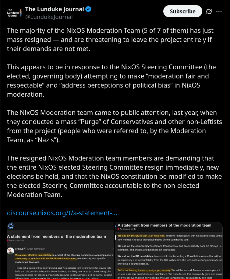 I hope they do leave, that would be a huge step forward for NixOS. No more of these disgusting freaks destroying the project with their inane shit