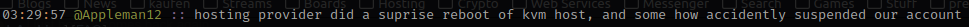 Site hasn't loaded for two days, and the site owner says that their hosting provider rebooted their server and "accidentally" suspended their account.