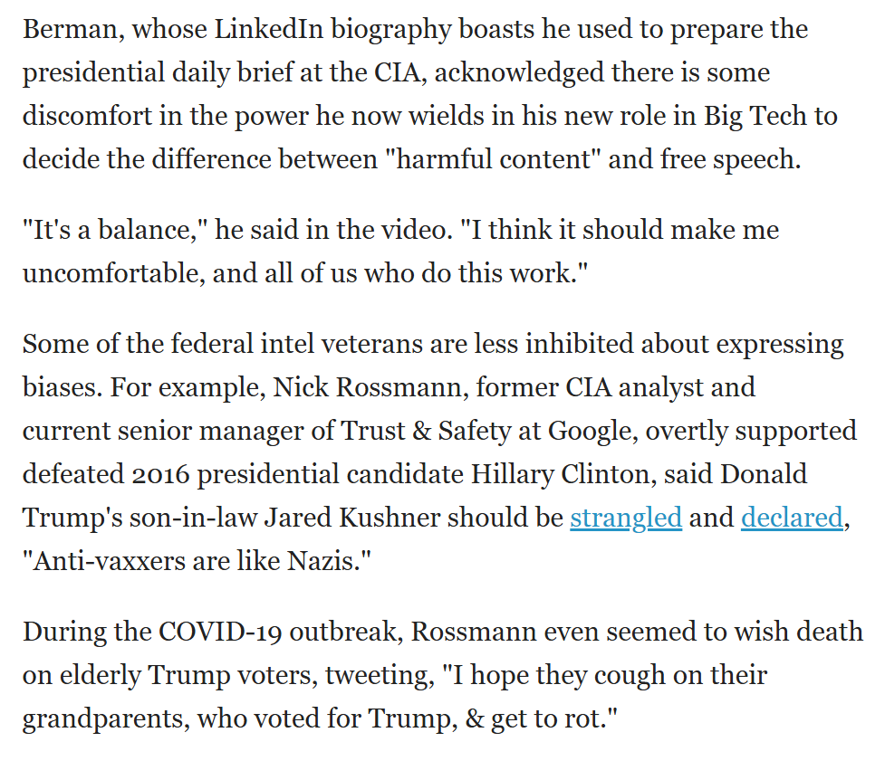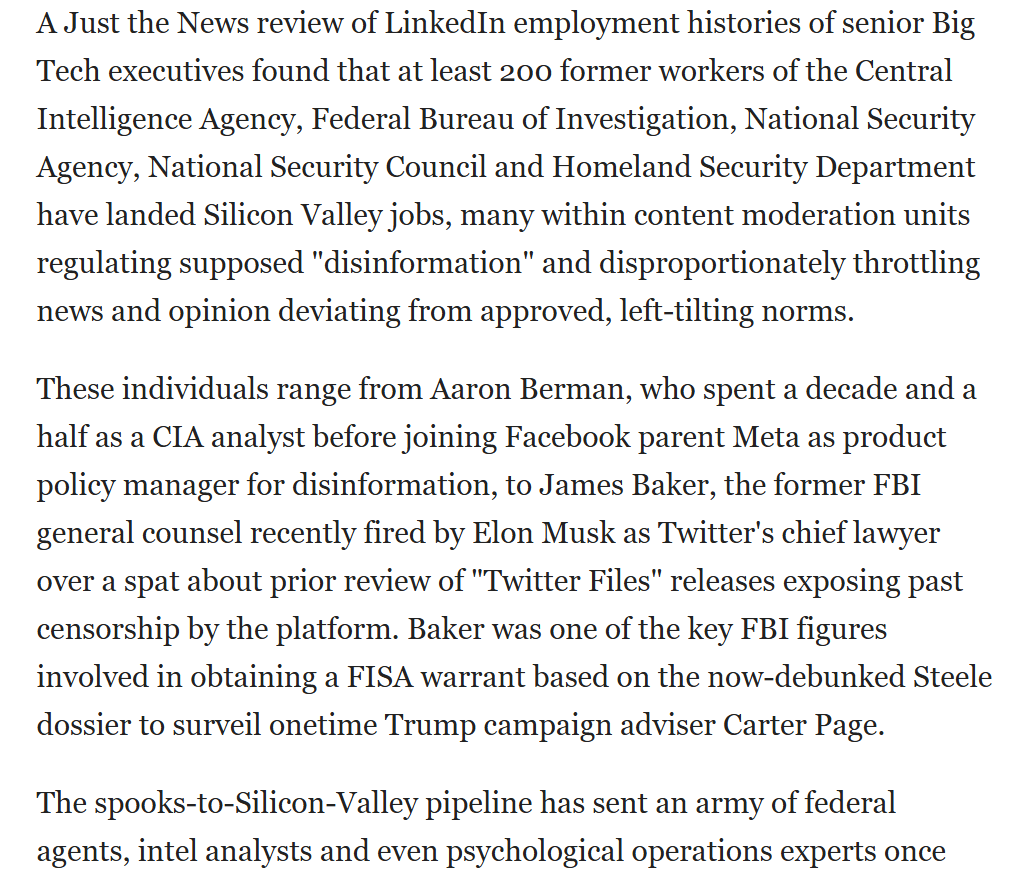 For example, you have Meta product policy managers for disinformation (ex-CIA) and senior managers of Trust & Safety at Google (also ex-CIA).