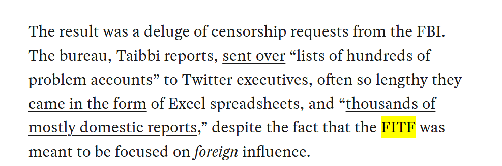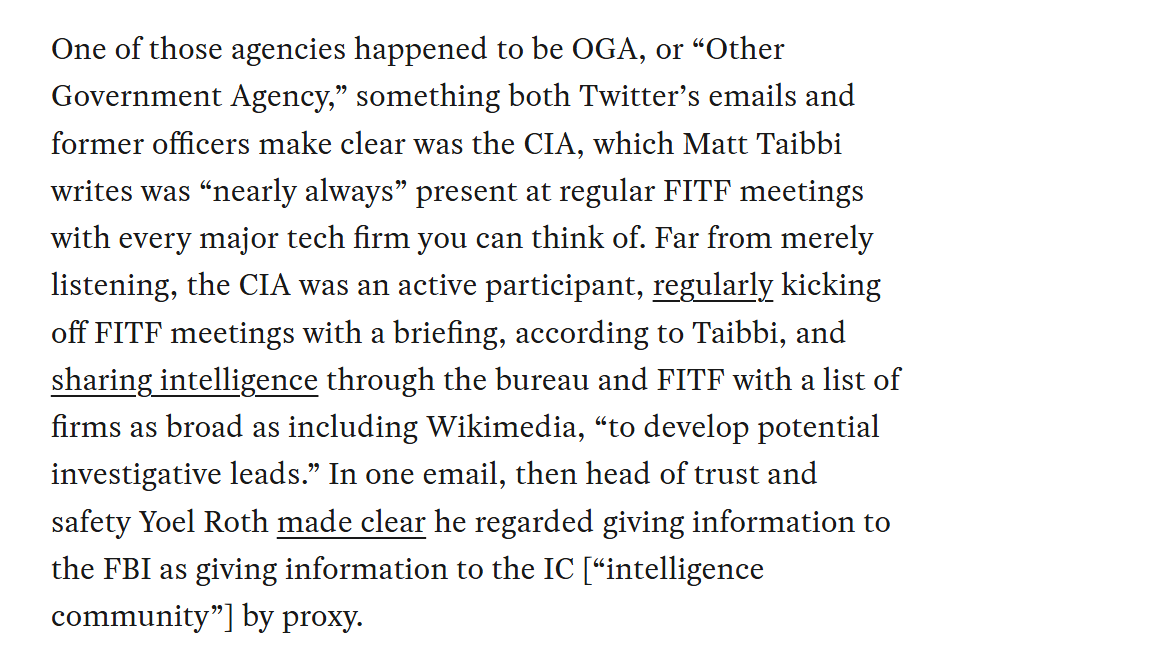 The Twitter Files revealed that both the CIA and FBI regularly met with Twitter, and there were so many ex-FBI agents at the firm that they had their own slack channel. FITF meetings, which were supposed to be about foreign influence, usually focused on "domestic intelligence."