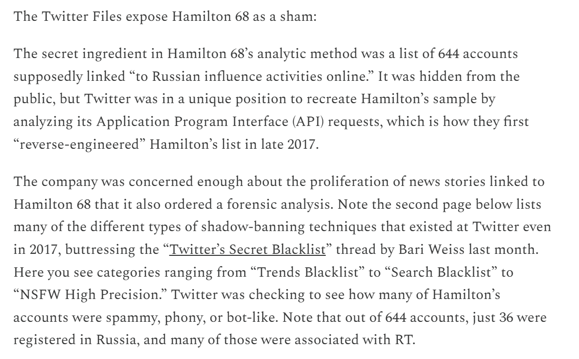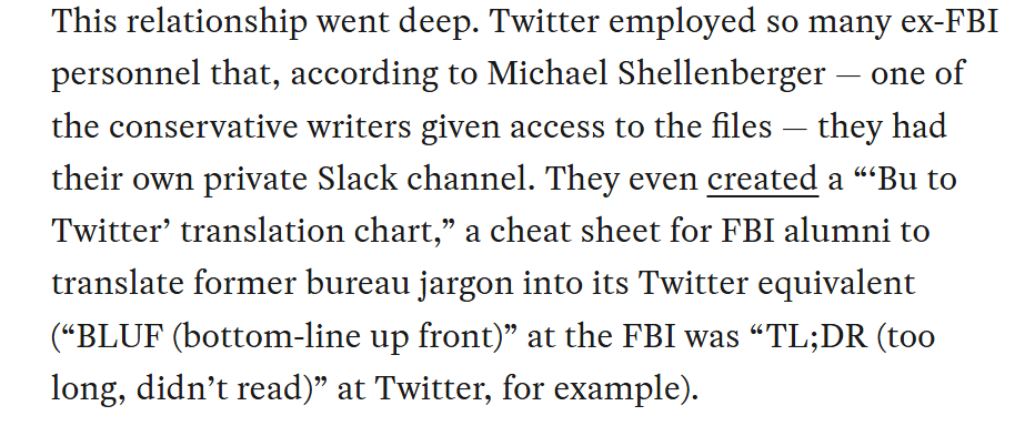 I've previously covered the Twitter Files, so I'll just reiterate: extensive FBI contacts including individual account deletion requests, multiple types of blacklist/algorithmic suppression.