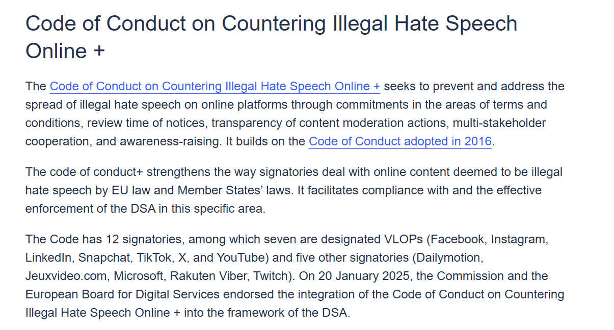 (Adhering to the 2016 (later updated in 2018) Code of Conduct on Hate Speech is evidence of compliance with the DSA, which gives platforms a strong incentive to police speech on their own rather than wait to get flagged)