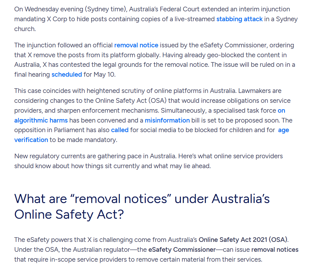 This culminated in Britain's 2023 Online Safety Act. Australia has actually gone further than Britain; its version of the OSA (2021) gave its e-safety commissioner (position created in 2015) the ability to remove content at will.