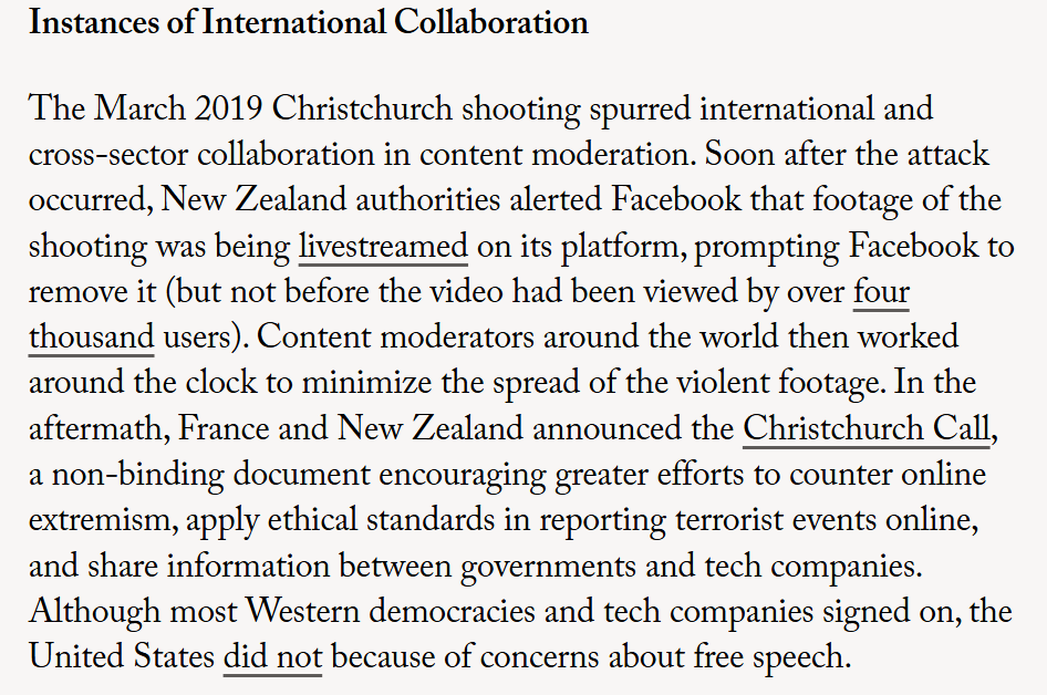 In 2019, New Zealand announced a pledge to "counter online extremism," which most tech companies and Western governments immediately signed. The US did not (citing freedom of speech) until the Biden admin took office in 2021.
