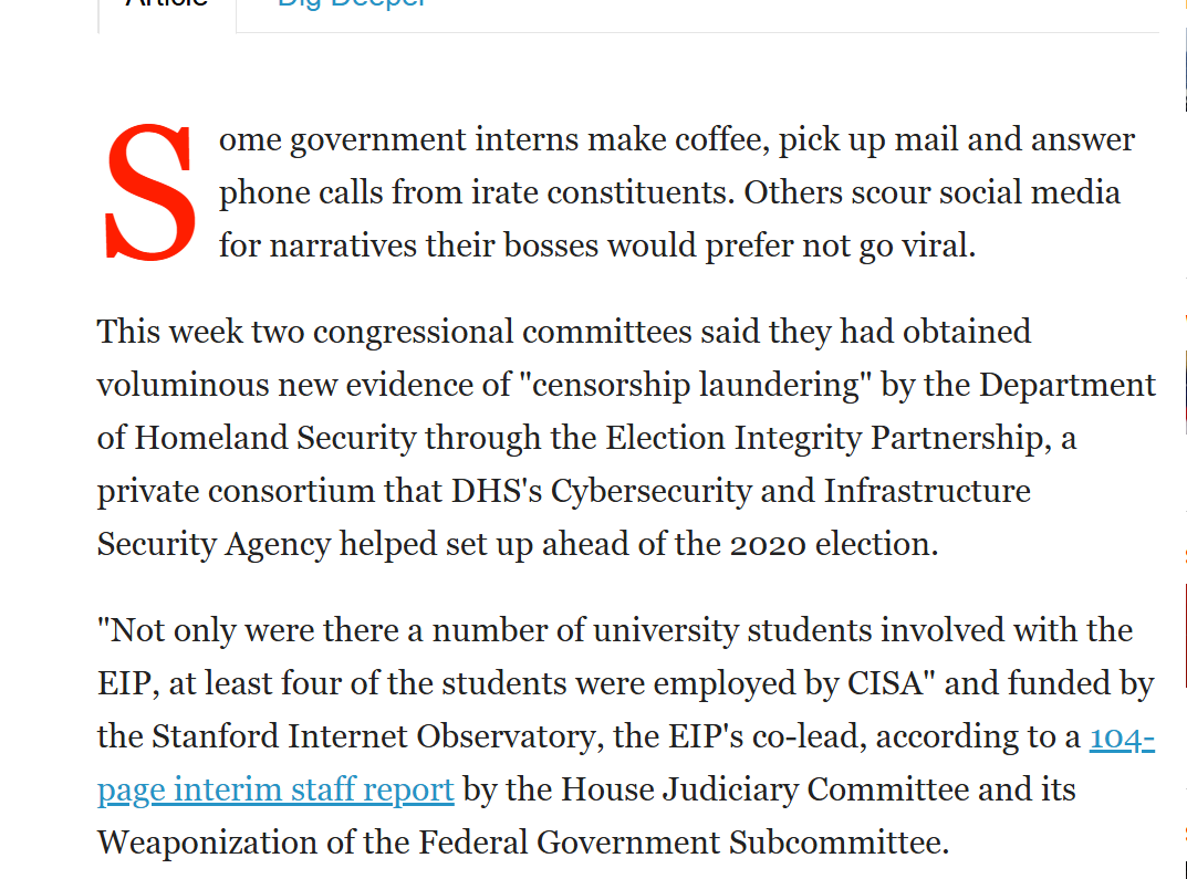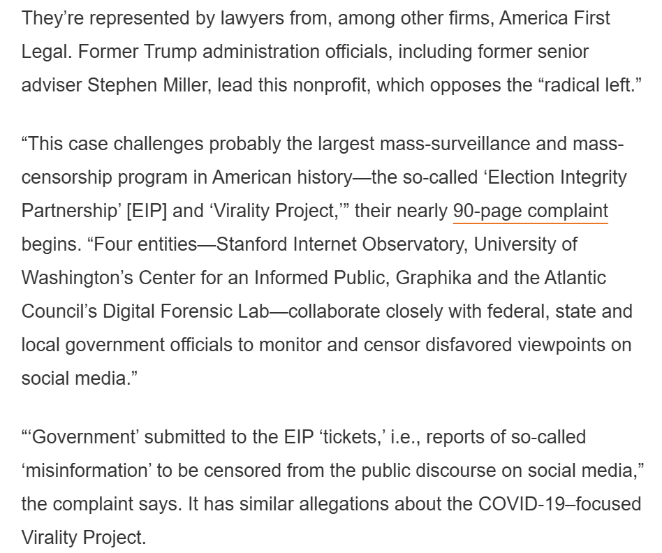 An example of one of the most academic orgs used by these various alliances was the SIO, the Stanford Internet Observatory, funded by the US government. This was eventually dismantled after House Republicans noticed it kept id'ing conservative arguments as disinformation.