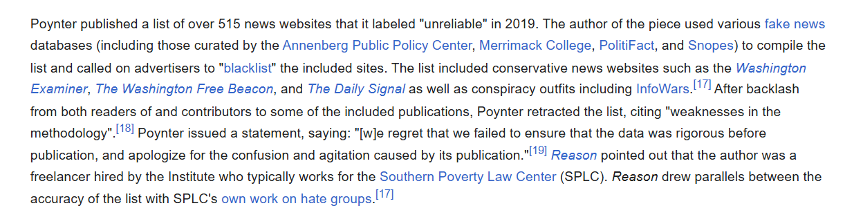 The IFCN was founded by the Poynter Institute, a school of journalism, in 2015, after a $1M foundation grant. They hired an ex-SPLC employee to create a list of 515 orgs to be used in ad blacklists, including mainstream conservative ones like the Washington Examiner.