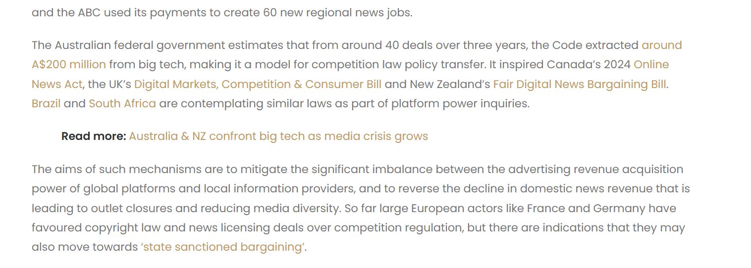 Canada provides several privileges for officially-recognized media organizations, such as tax refunds up to 35% of labor costs and huge transfers directly from platforms where their content is posted. Australia, UK, South Africa, Brazil, and NZ have similar programs.