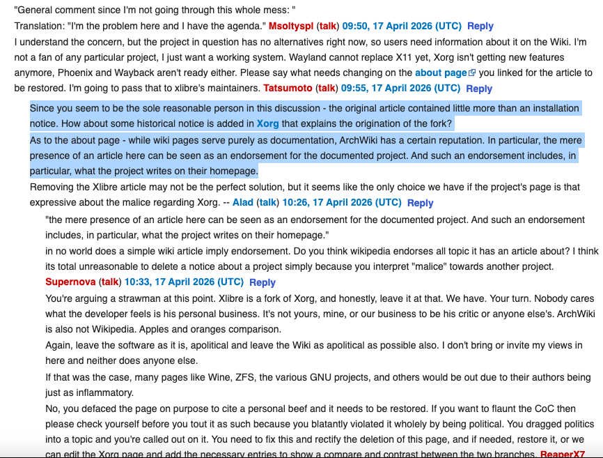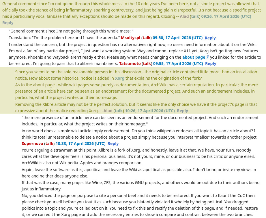 If you want my opinion: They're the fall guy. There are commands coming from up above and they're using this little wiki admin who doesn't interact with the page anyway as the face of it. The actual actors get to hide in the shadows and find other ways to manipulate the project. Start archiving the wiki, now. It's XLibre today but it could be Grub2 once systemd-boot gets attestation, TPM, and verified ID support.